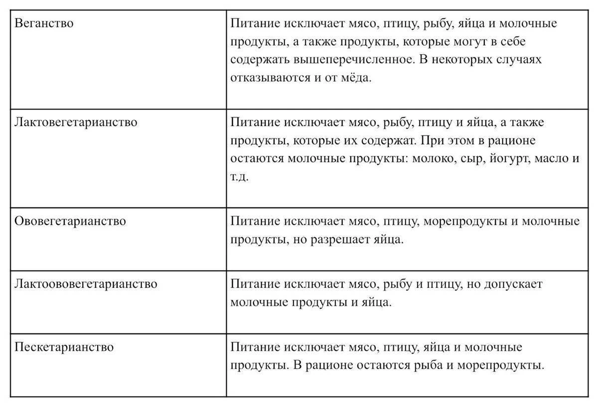 Помимо вегетарианства и веганства, в современной диетологии имеются следующие виды растительного питания (на самом деле их больше, но мы остановимся на тех, которые точно не причиняют вред здоровью при сбалансированном и рациональном подходе):