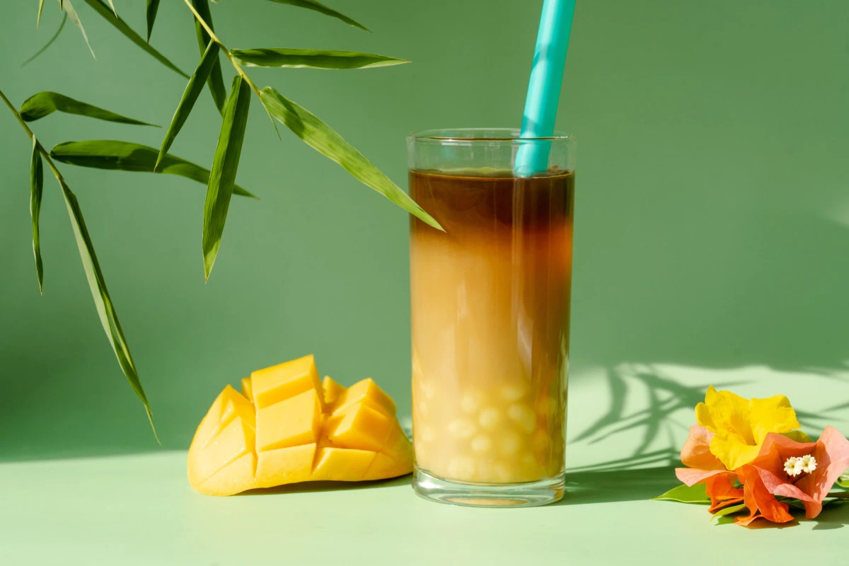Не совсем коктейль, но выглядит даже эффектнее! Бабл-ти — это холодный чай с шариками тапиоки. Но во ВкусВилле тапиоки нет, и мы решили сделать шарики, которыми её можно заменить, из крахмала и манго. На основе этого же рецепта можно готовить и Bubble coffee, всего лишь заменив чай на кофе.