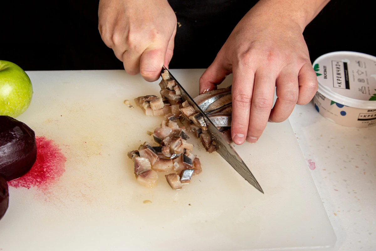 Селёдку нарежьте небольшими ломтиками.