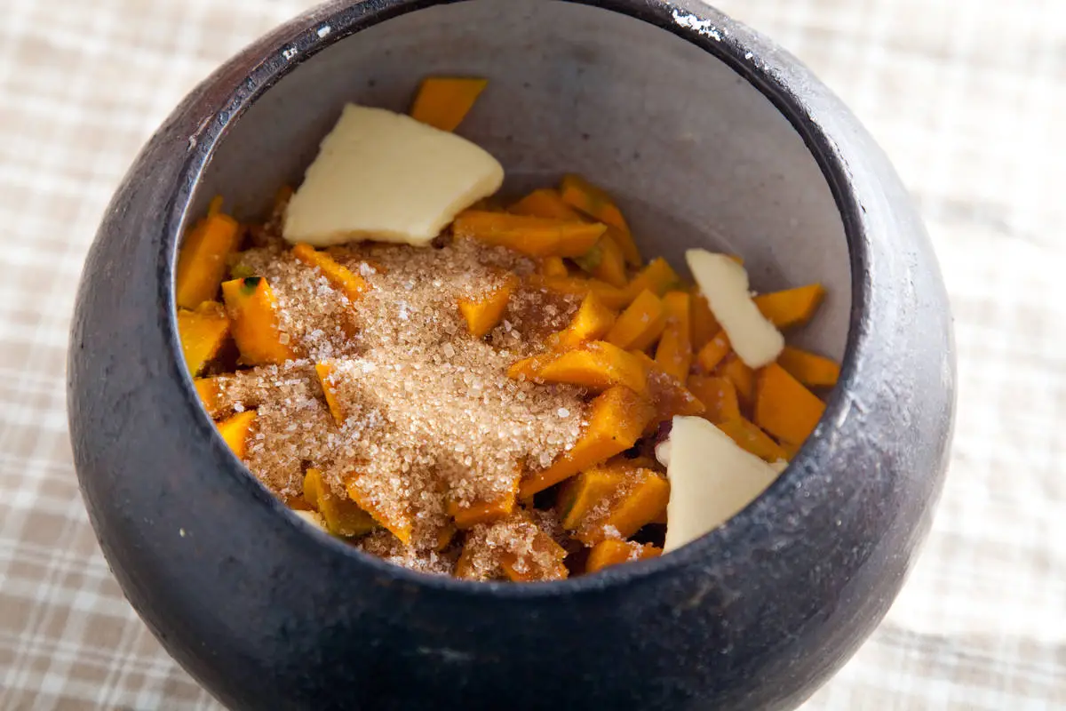 Тыкву очистите и нарежьте кубиками, сложите в горшочек, добавьте сахар, щепоть соли, сливочное масло, залейте стаканом воды, накройте крышкой и поставьте в духовку на 200 С или варите на огне до мягкости.