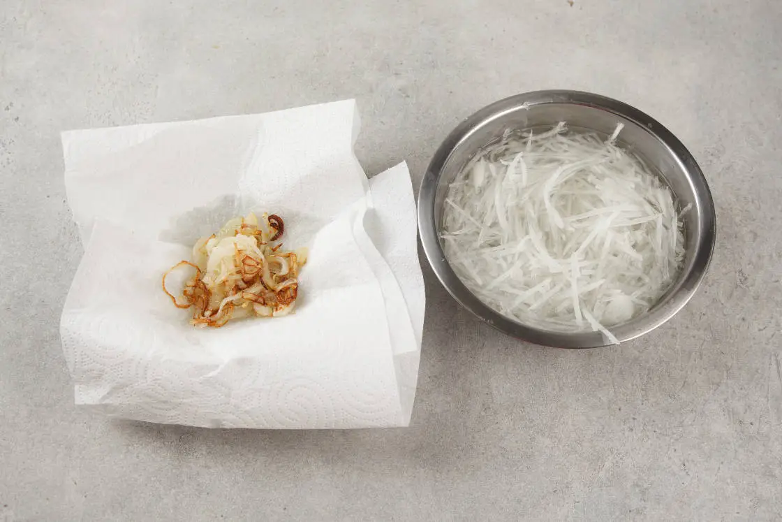 Лук нарежьте тонкими полукольцами и обжарьте до золотистости, переложите на салфетку, чтобы впитался лишний жир.