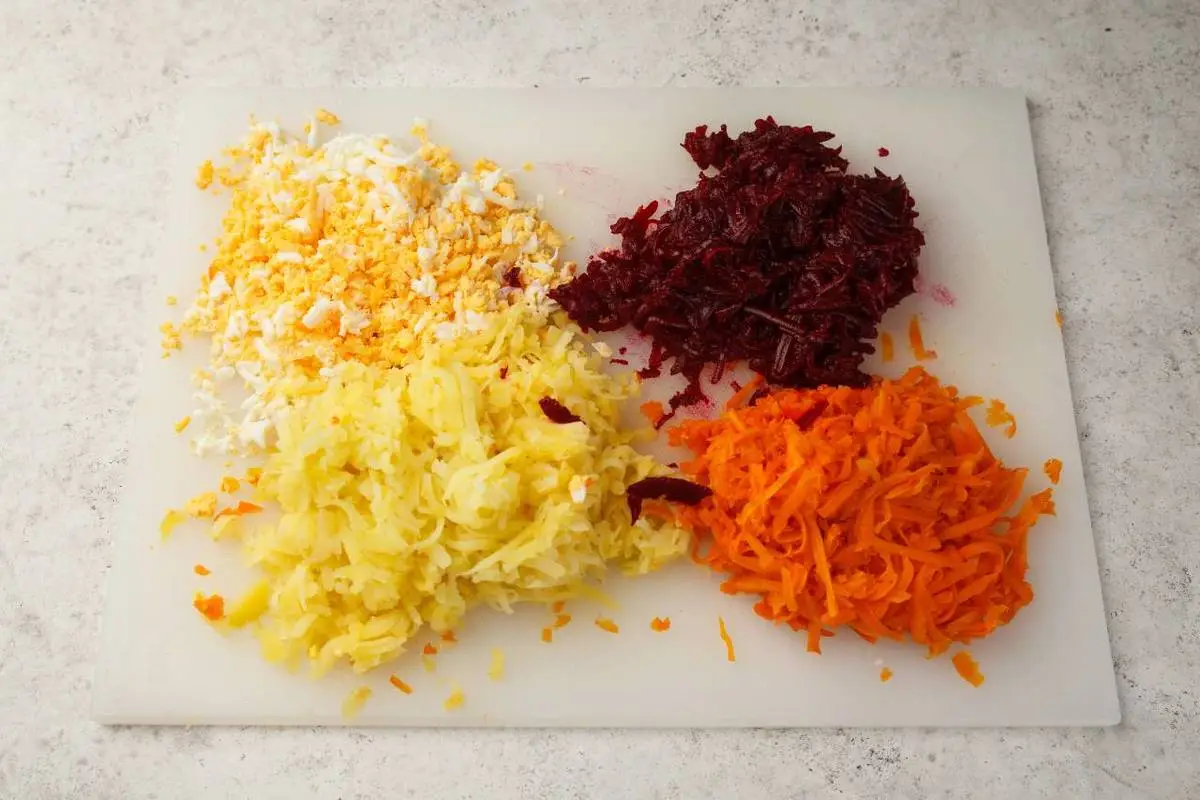 Яйца сварите вкрутую, охладите и очистите от скорлупы, натрите. Овощи очистите от кожуры и также измельчите на средней тёрке. Селёдку нарежьте небольшими кусочками.