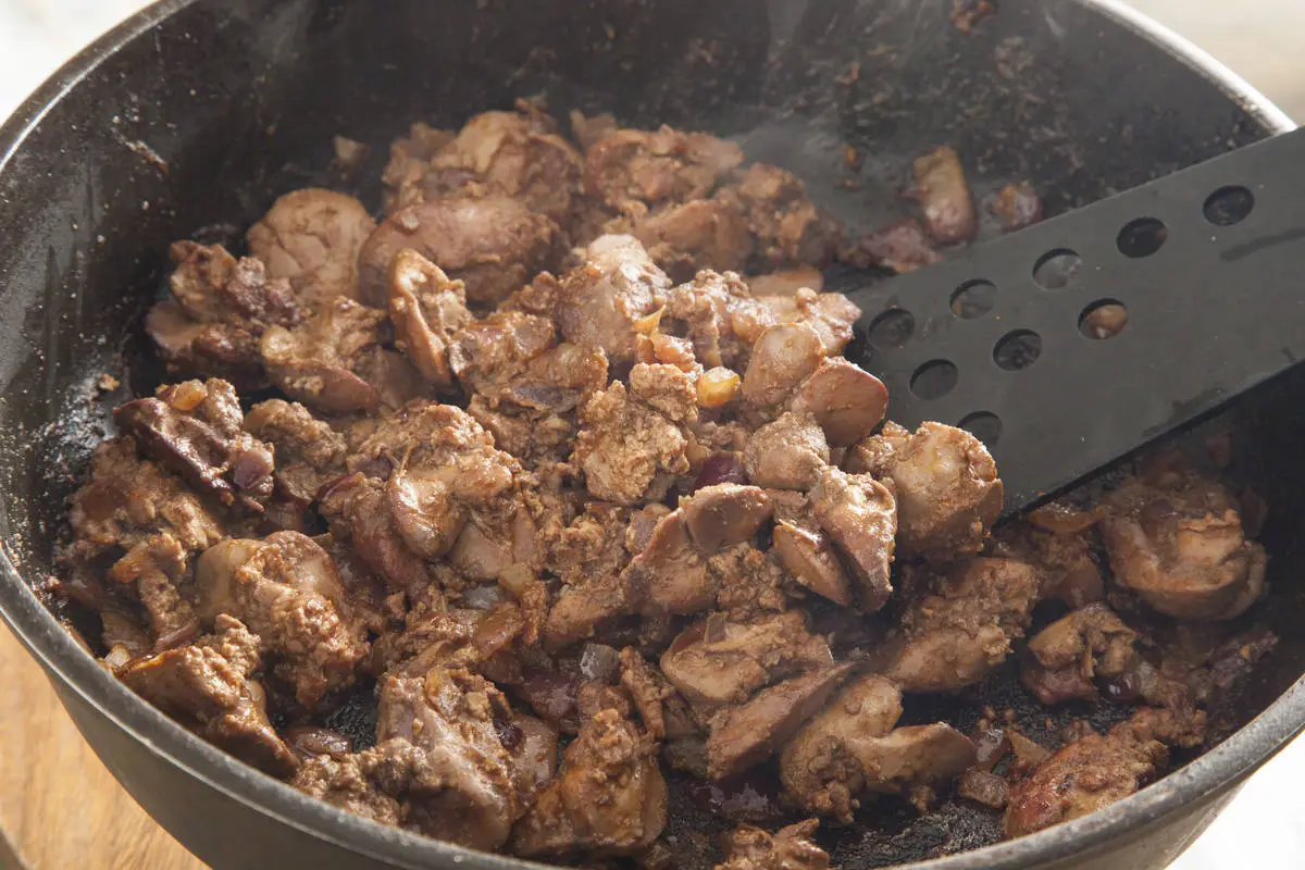 В той же сковороде обжарьте печень в два-три приема, выкладывая каждый раз так, чтобы между кусочками печени оставалось достаточно места.