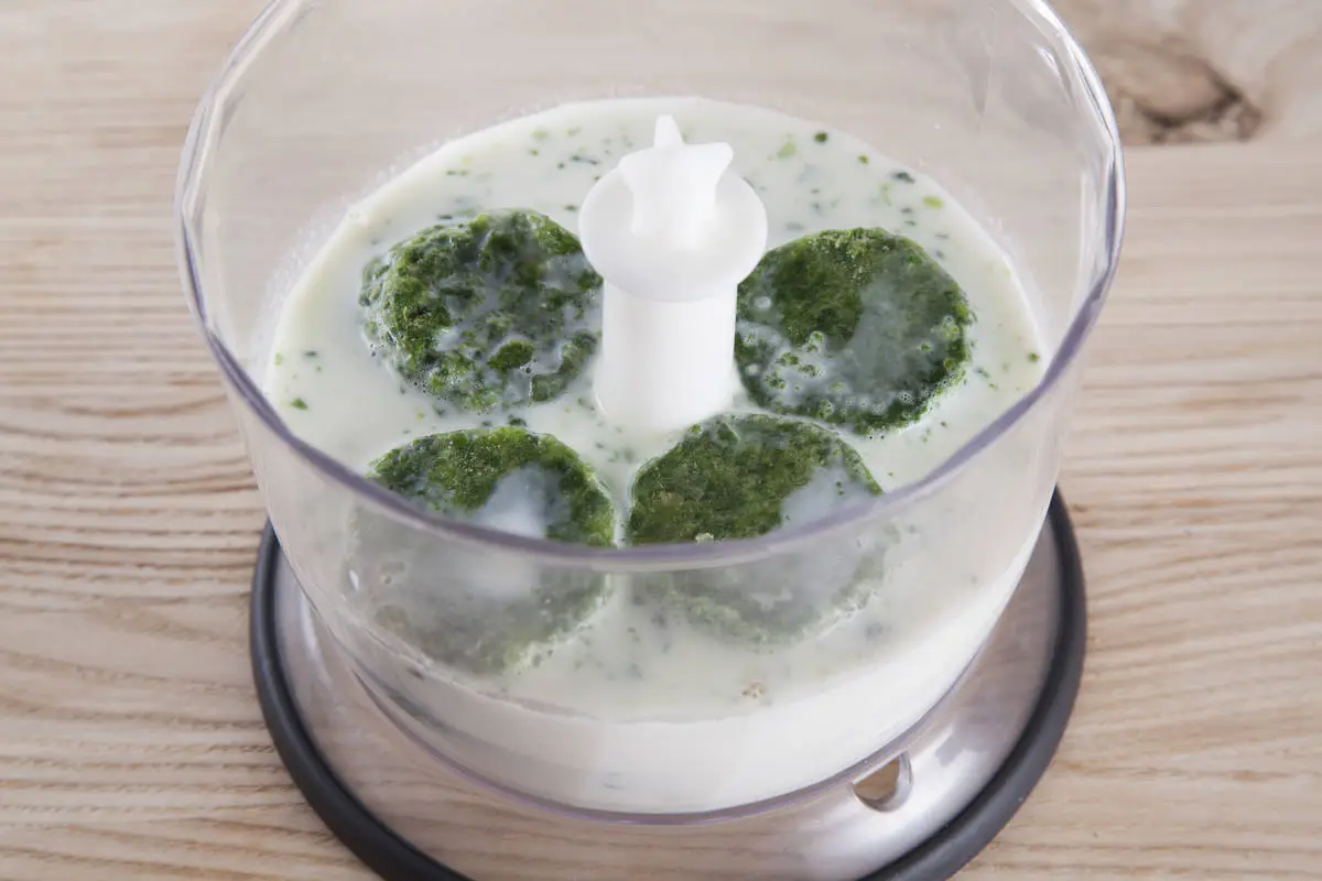 Замороженный шпинат выложите в молоко и слегка подогрейте на медленном огне, дождитесь, пока шпинат полностью растает, пробейте в блендере до однородности.
