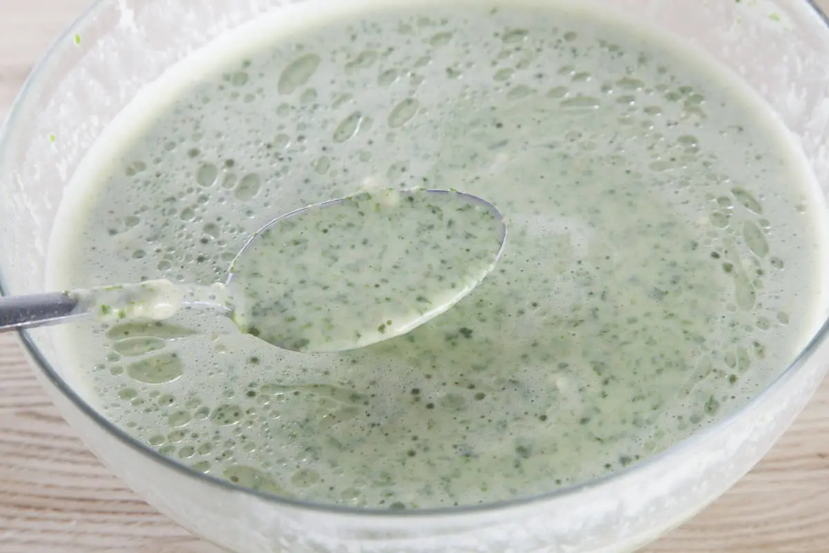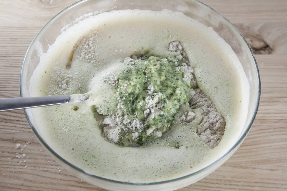 Яйца взбейте с солью, смешайте со шпинатным молоком, добавьте просеянную муку, сахар, хорошо размешайте и оставьте на полчаса.