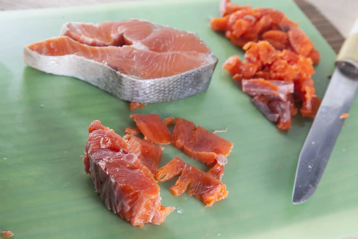 Для припека с размороженных стейков аккуратно снимите кожу и нарежьте рыбу тонкими кусочками.