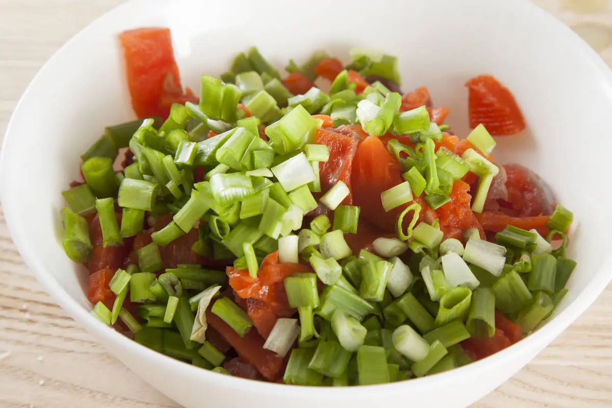 Перья лука порежьте колечками, с половины лимона снимите цедру мелкой теркой, смешайте лук, цедру и рыбу, посолите.